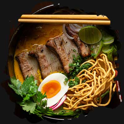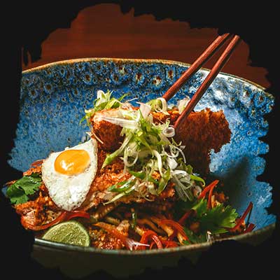 Yellow Curry with Japanese Twist, Egg, Onion, Crispy Noodles