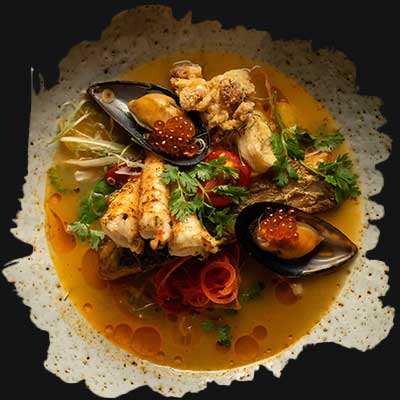 Thai Hot & Sour Soup with Seabass, Prawns, Shells, Calamari, Rice
