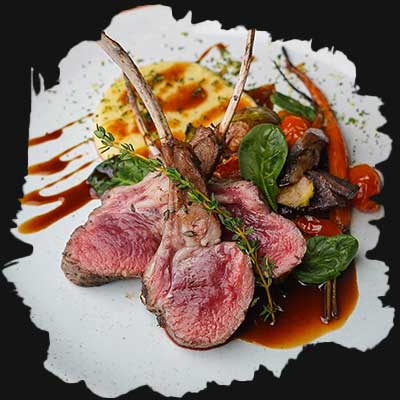 Lamb Rack Roasted with Herbs & Garlic, Roasted Veggies, Mash, Red Wine Sauce