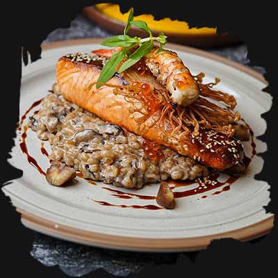 Japanese Style Grilled Salmon with Sweet Soy Glaze, Mushroom & Chestnut Orzotto, Ikura, Tiger Prawn