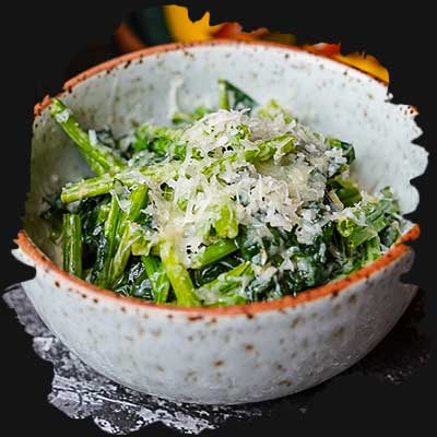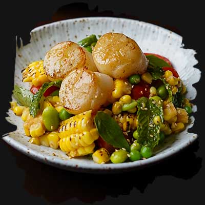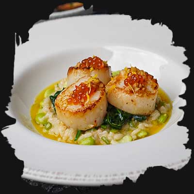 Creamy Parmesan & Edamame Risotto with Scallops, Garlic Oil, Spinach & Ikura