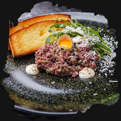 Horseradish, Red Onion, Gherkins, Rocket, Parmesan, Quail Egg, Brioche